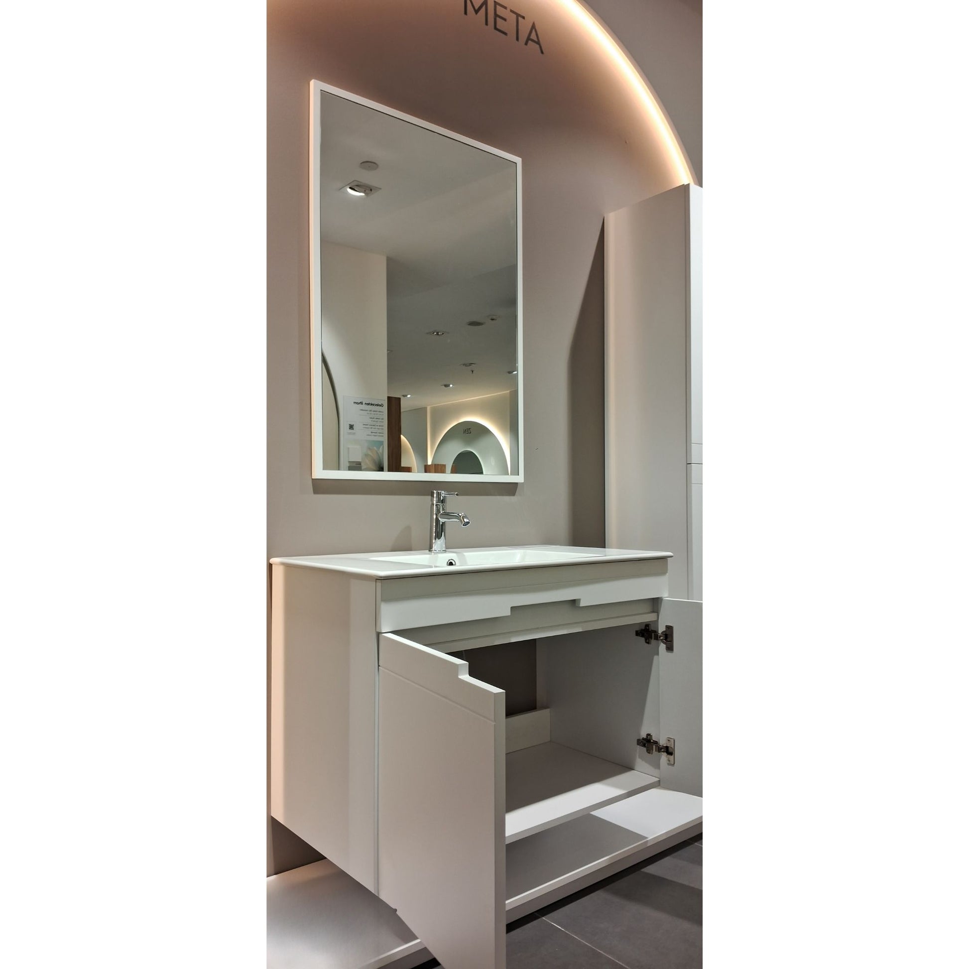 Modernes Badmöbel für höchste Ansprüche – Die Serie Meta überzeugt mit klaren Linien, griffloser Optik und zeitlosen Farben. Hinter zwei Soft-Close-Türen finden Pflegeartikel, Handtücher & Co. eine ordentliche Heimat.